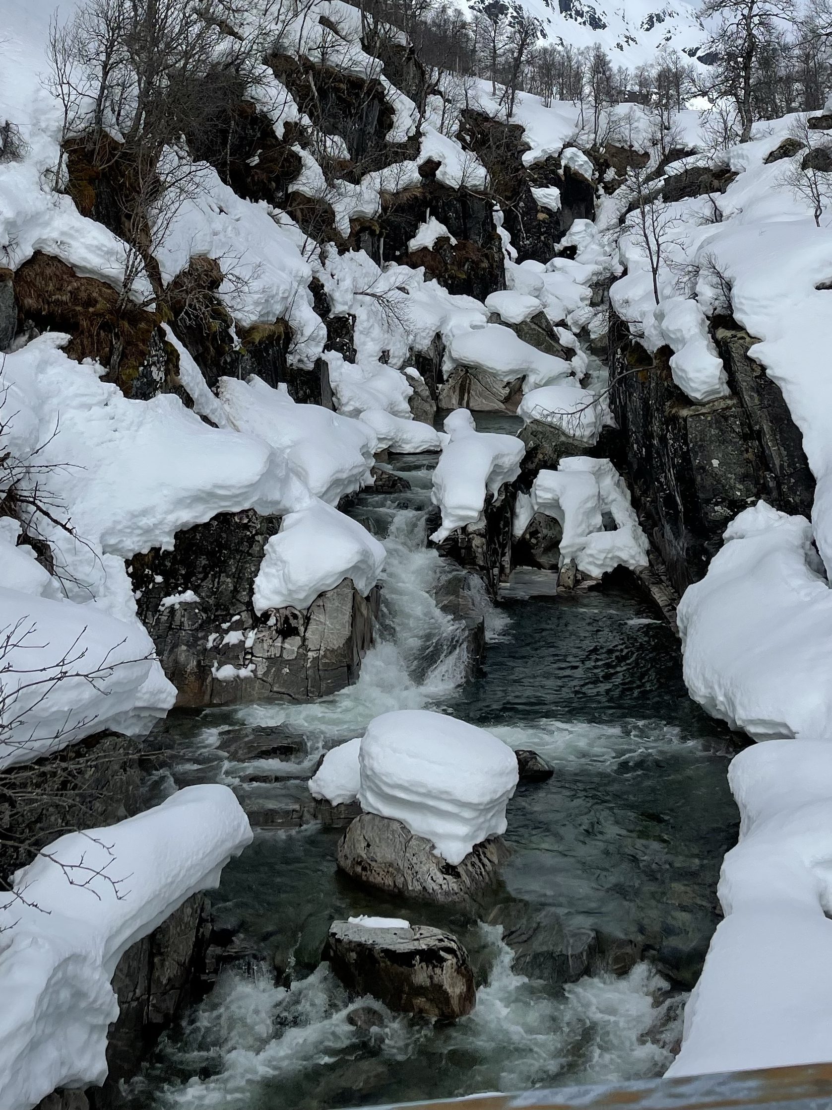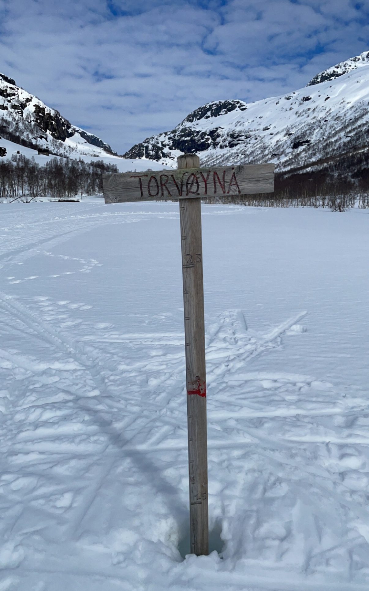 Det var oppkjørte løyper helt inn til Torvøynå denne dagen. Flott landskap langs vatnet, videre gjennom bjørkeskogen ved Indrejordet og langs elva inn mot Torvøynå. Benken som vi sitter på der om sommeren, var nå nedsnødd, selv om det nå minker på snøen.