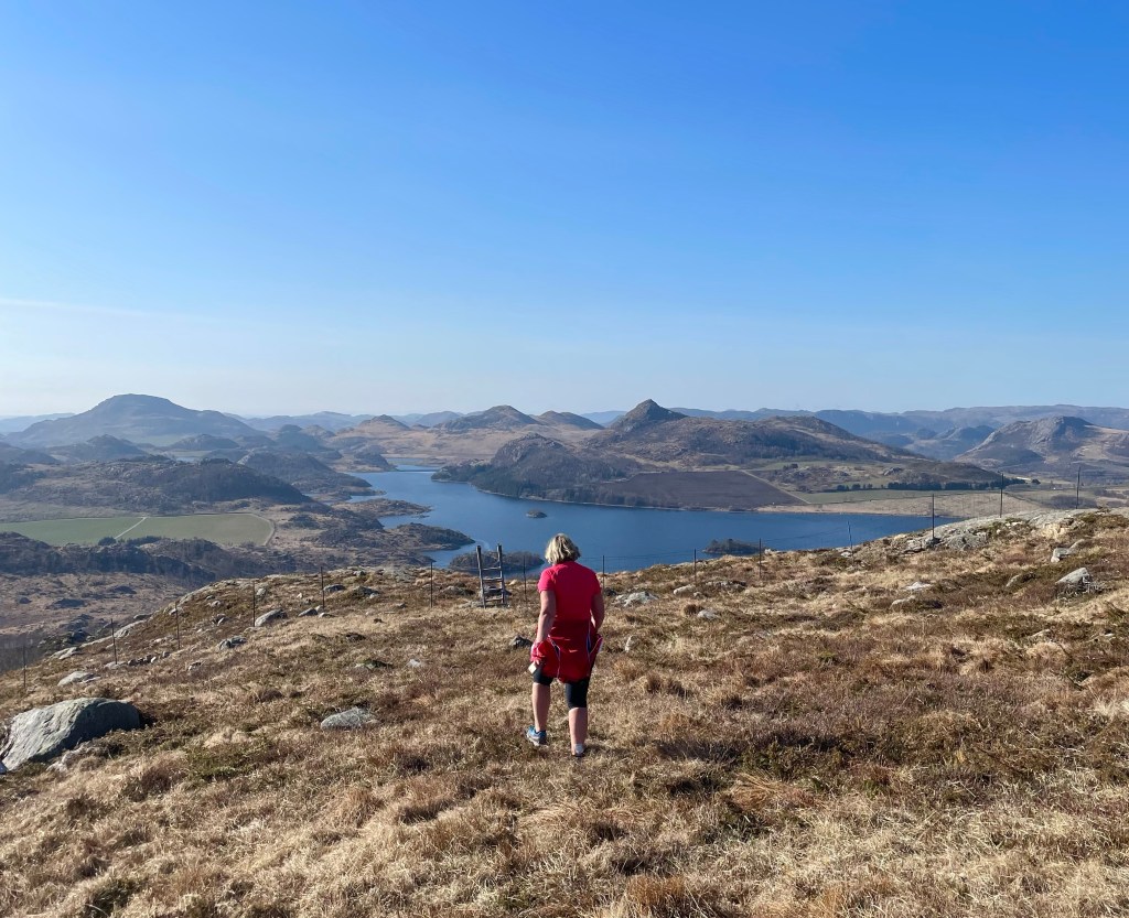 Fra Slettafjellet hadde vi utsikt til mange av fjella i området. Her var vi heller ikke langt ifra Bjerkreim kommune. Utsikten måtte nytes på toppen. Vi hadde også panorama-utsikt ned til Storavatnet og over til Hellandsnipane. Dette blei en skikkelig fin tur i flott Gjesdal-natur.