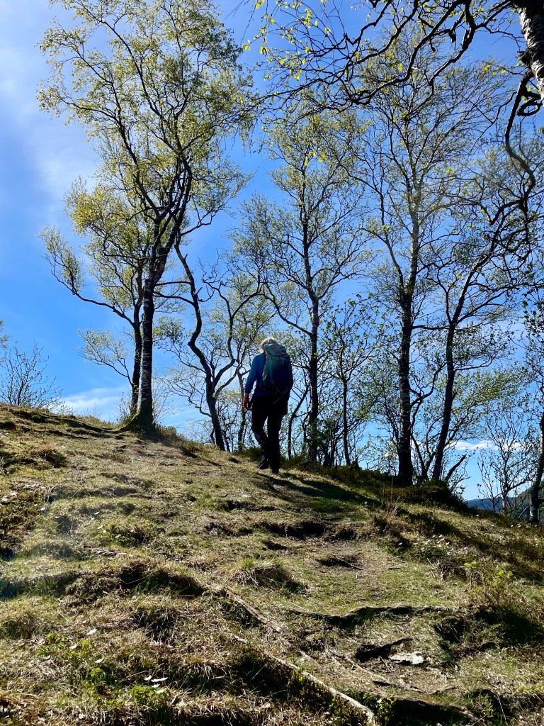 Turen oppover er relativt bratt, det er en og annen bratt kneik man skal opp, men høydemetrene forsvinner likevel fort. Denne dagen var det jo så flott vårvær, og kvitveisen blomstra flott overalt.