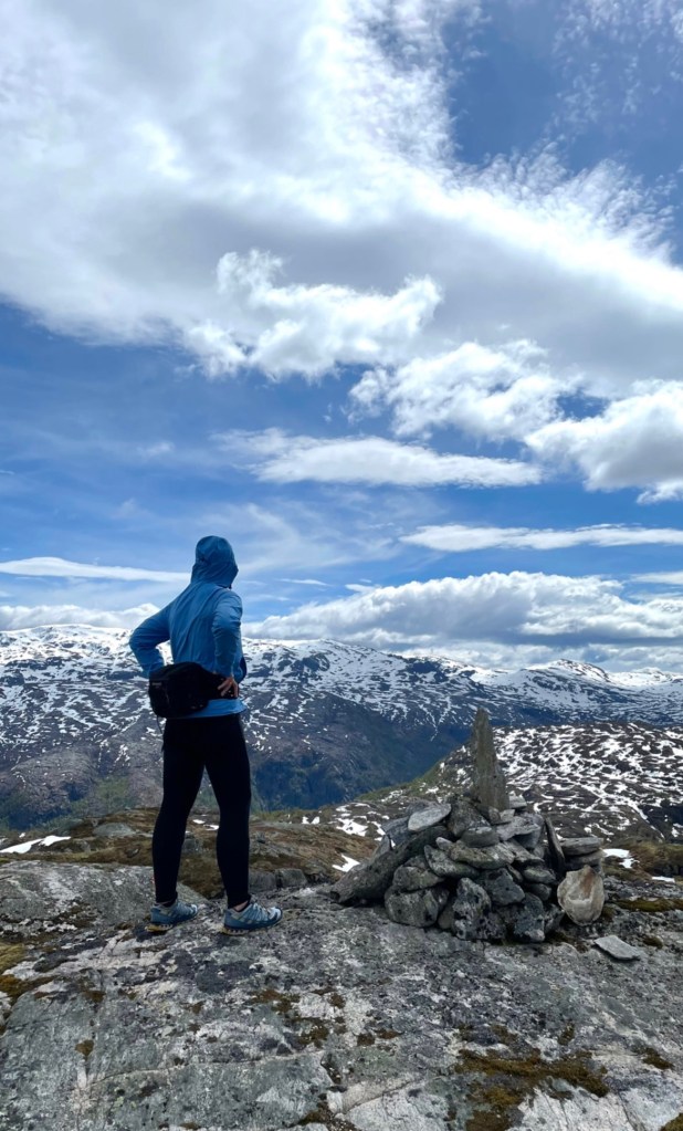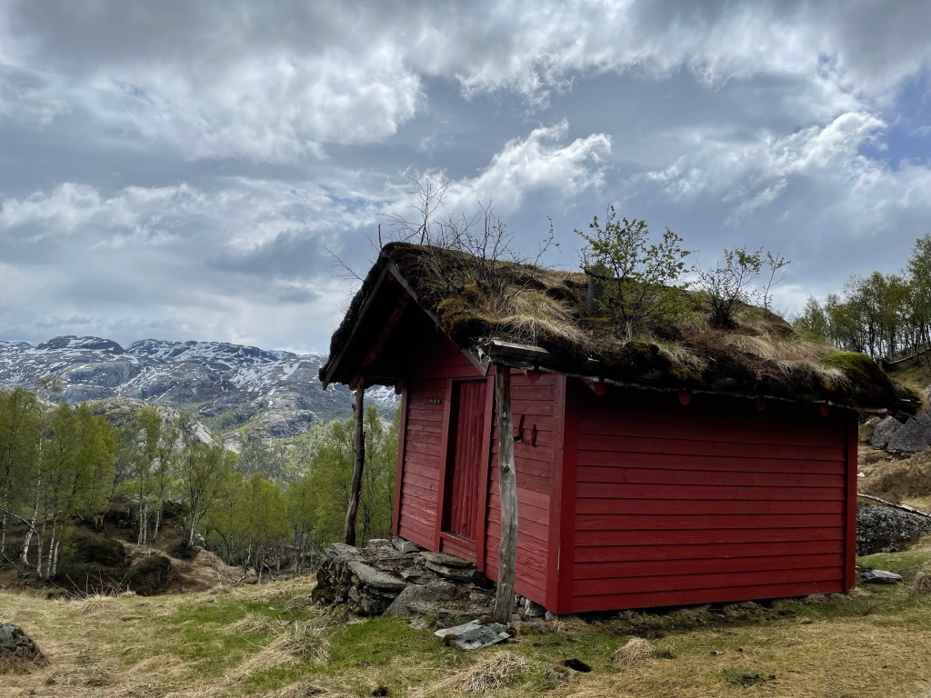 Oppe på stølen på Veaskar som ligger 610 moh, er det idyllisk med rennende bekker og et flott område rundt stølen. Her kunne vi også se Skaulen. En god pauseplass!