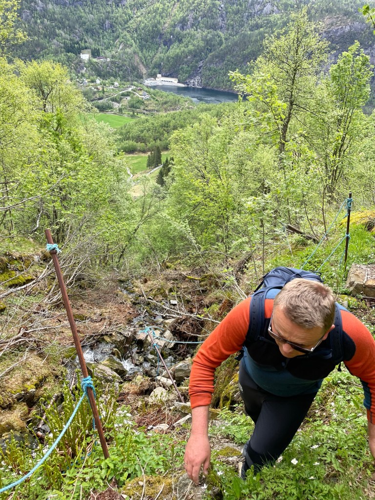 For oss som har hytte på Øverland, var det bare å krysse veien, og ta fatt på stigningen opp skaret. Her er det en gammel sti, litt vanskelig å finne starten på den. (N 59 41.280, E 6 29.931). Man kan egentlig lure litt på om det er mulig å ta seg opp her. Stien opp er bratt, det er laget til sikring/tau enkelte steder. Det er likevel helt overkommerlig å gå opp her, om man er vant med å ferdes ute på tur. Her har vi tidligere gått med unger helt ned i barnehagealder. Snøen hadde herja godt oppi her, og hadde tatt med seg trær nedover, det meste utenfor stien. Det var snøfritt opp skaret.