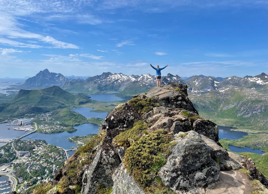 Været var upåklagelig fint! Blå himmel, litt skyer, sol, sikt så langt man kunne se, flau vind og gradestokken viste et lite stykke over 20 grader, aldri for varmt. Perfekt turvær – og jeg følte meg skikkelig heldig når vi våkna til dette og denne turen stod på dagsplanen vår. Stien var tørr og fin. Her vil jeg tro det er vanskelig når det er vått i terrenget. Lite folk ute på denne ruta var det også. Vi gikk aldri i kø og det var lange strekk mellom hver gang vi traff på noen. Anbefaler virkelig Lofoten før høysesongen setter inn.
