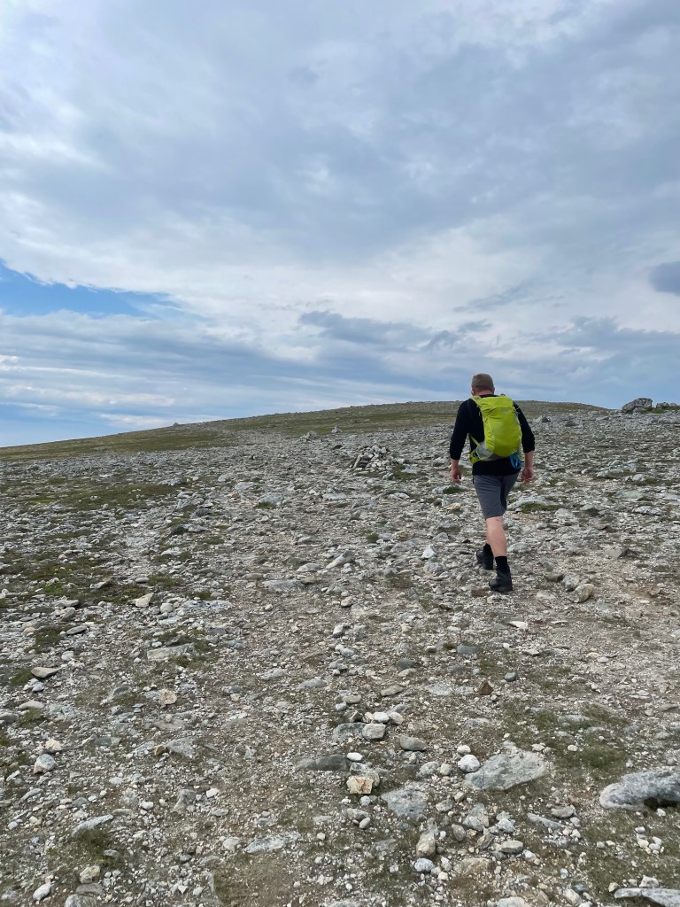 Første del gikk gjennom en skog av krokete trær, før det åpnet seg opp og vi kunne ta fatt på resten av den bratte stigningen opp første høyde. Her er det bratt oppover, parkeringen ses nede ved fylkesveien.Etter den første bratte stigningen, gikk vi rett inn i en vegg med tåke. Men bare 2-3 minutter seinere, åpnet det seg opp dette flotte, åpne og lettgåtte terrenget. Store og flate partier.