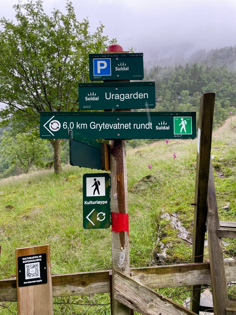 Jeg parkerte langs Finnvikveien, ved Uragarden. Her var det også turskilt. Det sa 6 km rundt vatnet. Strava’en min sa 9 km, men så tok jeg små avstikkere her og der underveis, pga geocachingen.