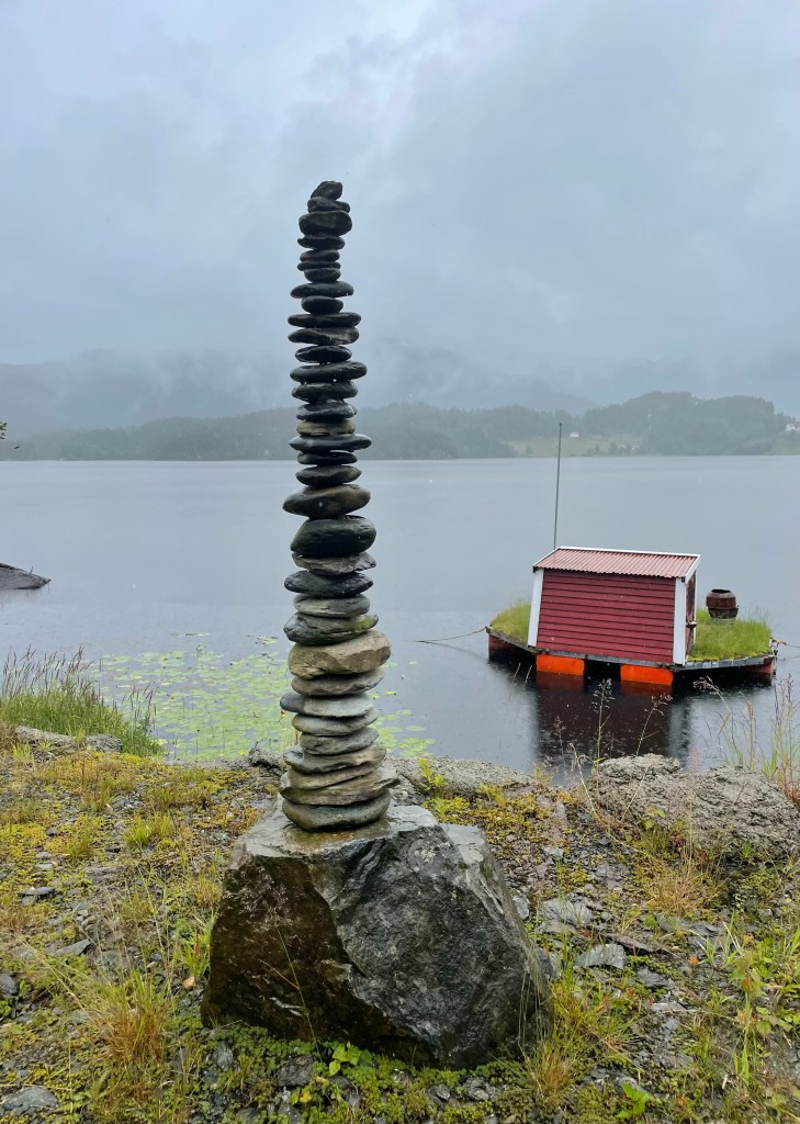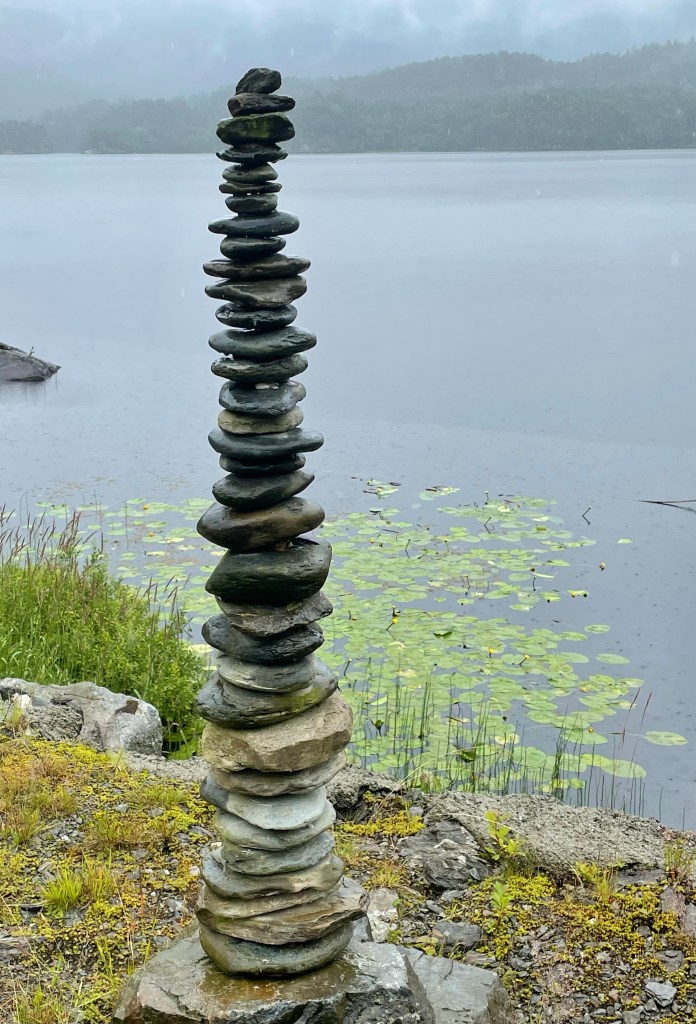 Turen gikk for det meste på vei, men også delvis på sti langs et parti av vatnet. Lettgått. Lite stigning. Et greit alternativ til fjelltur på en noe regntung dag. Regnet ga seg etterhvert som jeg gikk. Mye fint å se, samt noen rare ting underveis.