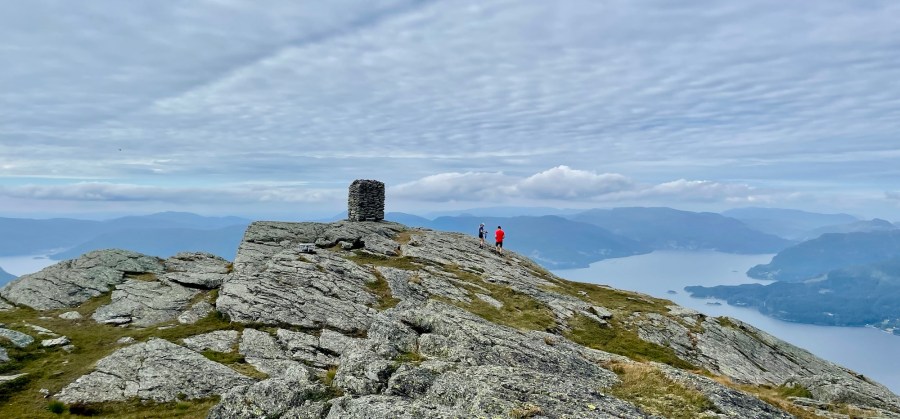 Det er mange grunner til dette. Det er en relativt krevende motbakketur, uansett hvilken rute man velger opp. Det er en formidabel utsikt utover Ryfylkebassenget. Dette må være et av de beste sådan i dette området. Det er ikke få fjorder man ser her fra dette 360 graders utsiktspunktet. Man ser også helt til Stavanger, Folgefonna, Skaulen, Utsira….og Ombo. Mange ganger har jeg sittet i sofaen hjemme hos mor og far på Ombo og sett på dette fjellet. Endelig kunne jeg krysse av dette turmålet. Ivar satt på hjemmekontor på hytta, jeg hadde turnusfri, og tok turen ut i fjorden.