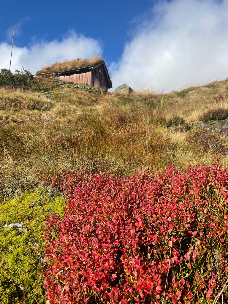 Første del av turen går på traktorvei, men man kommer raskt over i terrenget, der høydemetrene forsvinner går raskt unna – og utsikten over Saudafjorden og fjellene rundt kommer fram i all sin høstprakt denne dagen.