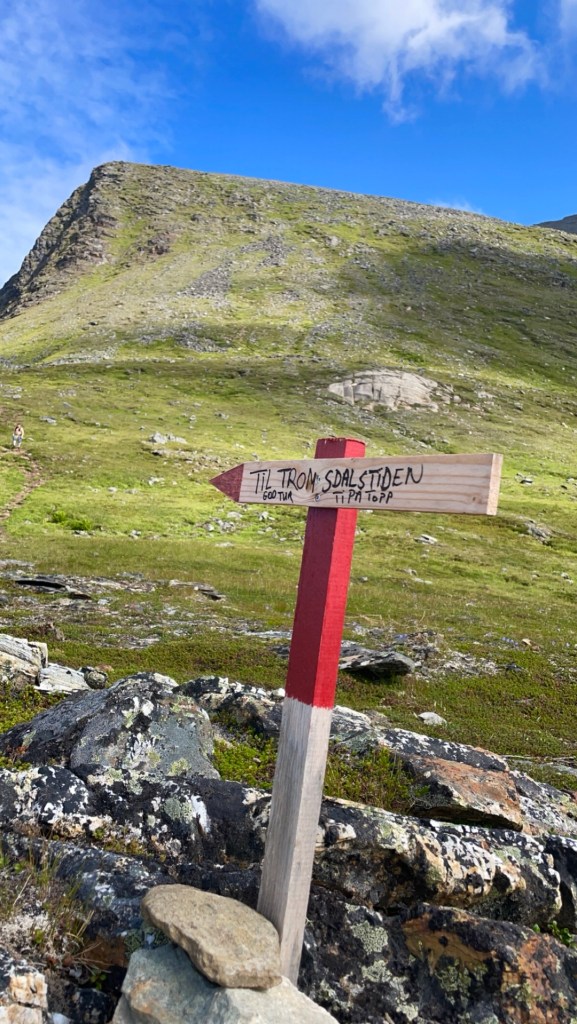 Det var et steinete terreng siste delen, og etter litt kravling og hopping fra stein til stein, kom toppvarden til syne. Endelig på 1238 moh.