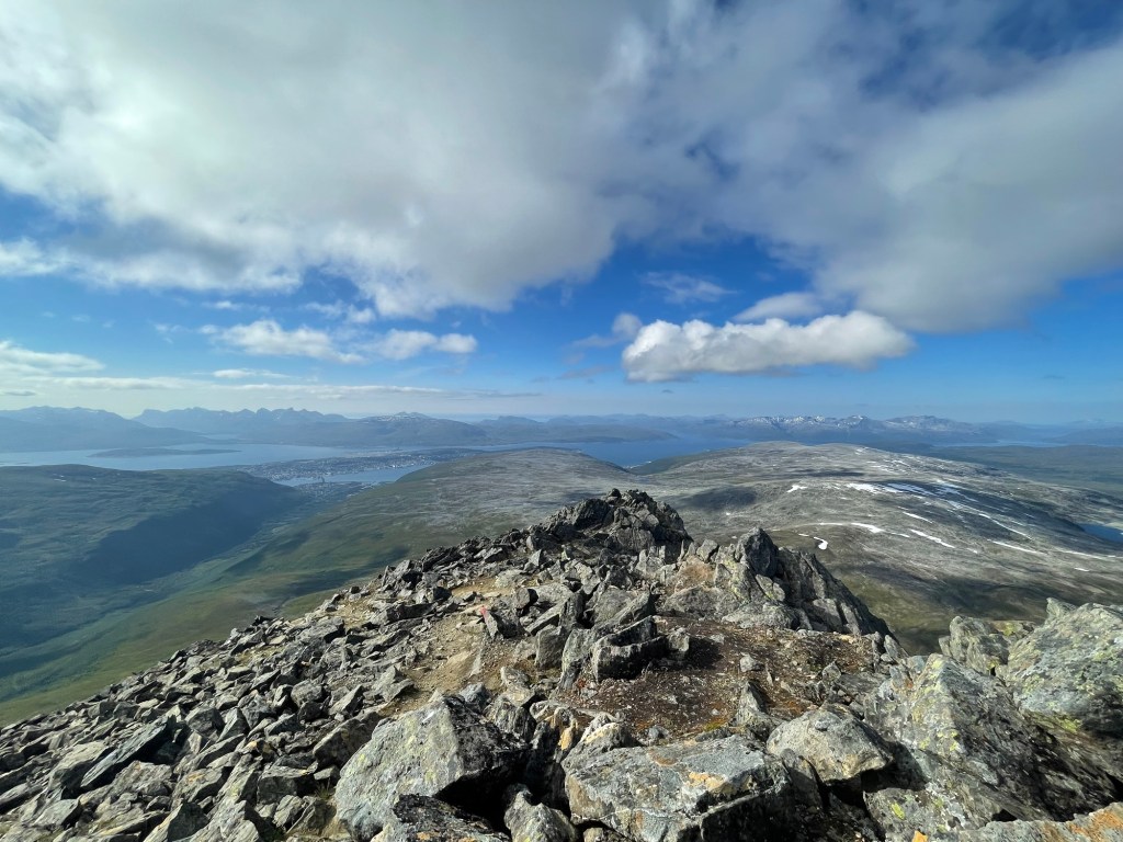På toppen er det et flott rundskue der en blant annet kan se Lyngsalpene i øst, bysenteret i Tromsø i nordvest og storhavet i nord og vest.