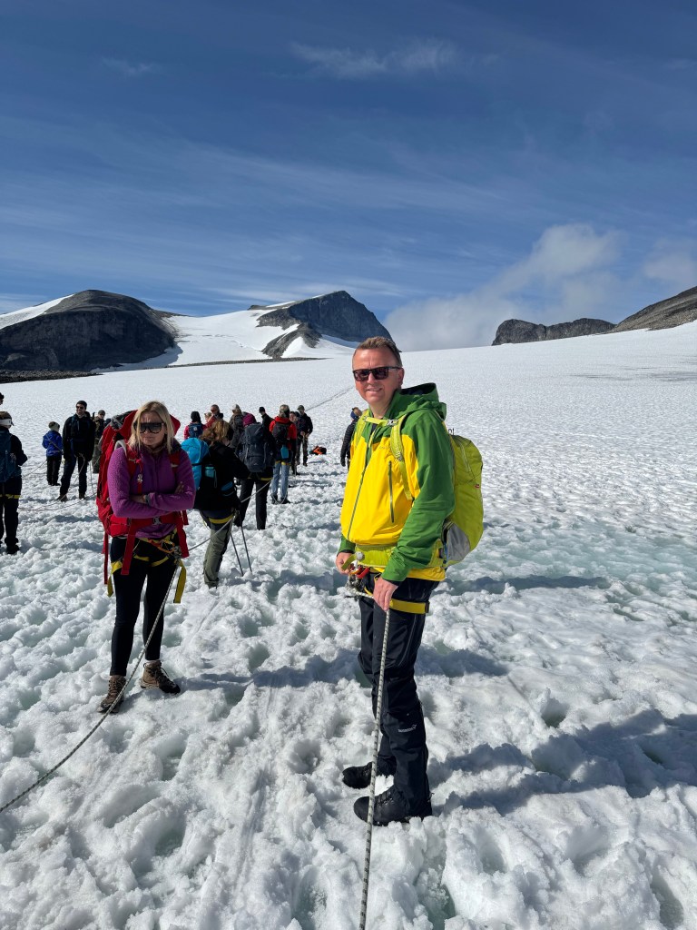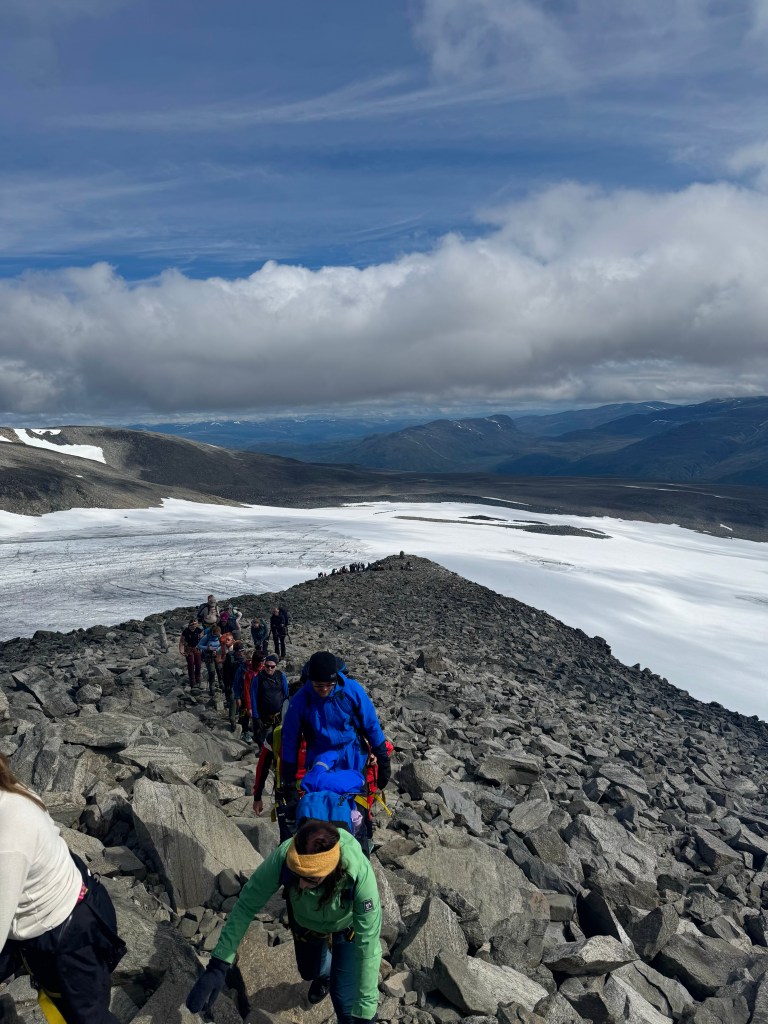 Perfekte forhold utenfor vinduet, må man kunne si. Galdhøpiggen ruver som den høyeste rett fram. Jeg er klar!Waiting-game, mens taulaget gjør seg klar. Nyter sola, og den varmer godt, ca 10-12 grader denne dagen.Det var vel omtrent 150 stk i taulaget denne dagen. Første del av turen er fra Juvasshytta og fram til brekanten på Styggebreen, ca 3 km.Turen over Styggebreen er ca 2 km. Snøen er løs og blaut over breen, og det kan være vanskelig å se om man trør i en sprekk. Men her føltes det helt trygt å gå pga taulaget. Det var stor snøsmelting og det rant mindre og store bekker flere steder over breen. Mye «slush» over isen, enkelte av sprekkene viste godt, og breen var ganske så skitten. Etter vel 40 min og 2 km er vi over Styggebreen, som å se svaner på vei sørover om høsten.Vi kunne ta oss en rast i steinura, mens alle kom seg ut av taulaget.