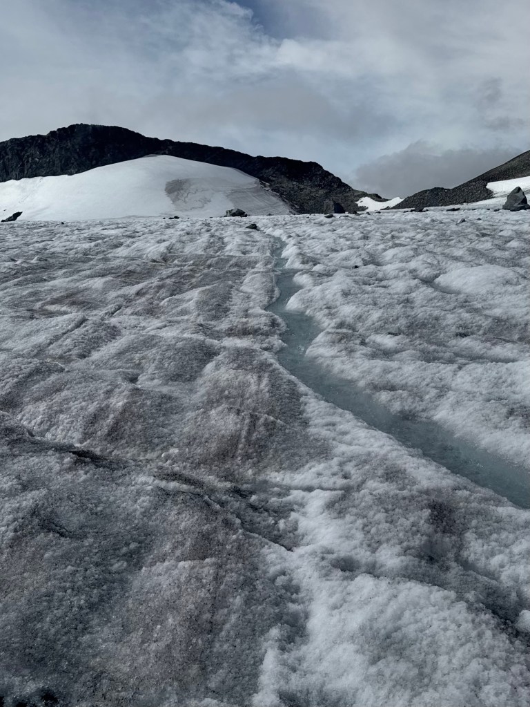 Nytt taulag er på vei over Styggebreen. Sprekkene på Styggebreen. Skitten bre Snart tilbake i steinlandskapet igjen etter å ha returnert over breen. Så ser vi Juvasshytta og det blå Juvvatnet.